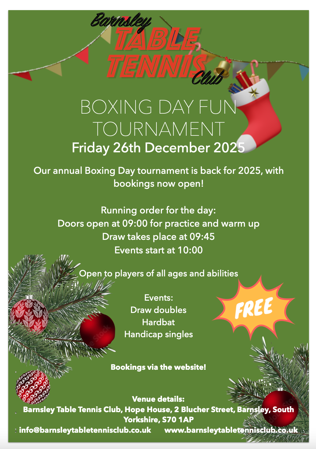 Come and join us for our annual boxing day tournament at Barnsley Table Tennis Club! It's open to everyone, whether you're a beginner or competing in local leagues and competitions.