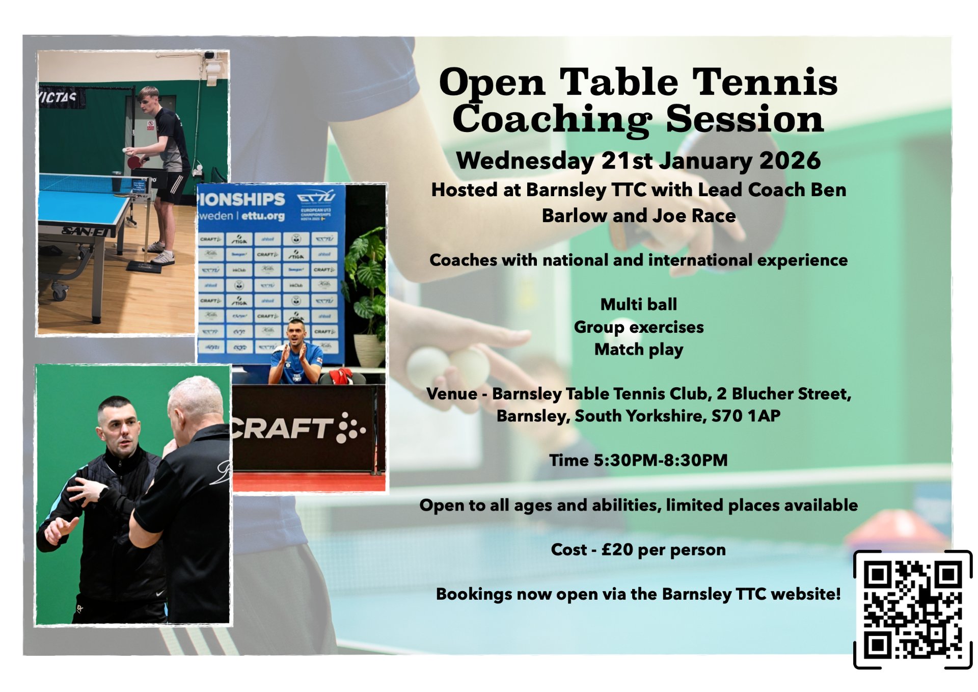 Following a successful trial, we are pleased to announce January's date for the next Open Coaching Session. The sessions are led by Barnsley TTC Lead Coach Ben Barlow and Head of Organisation Joe Race, with the sessions open to players of all ages and abilities. These three hour sessions will run once per month, with bookings required for each session.