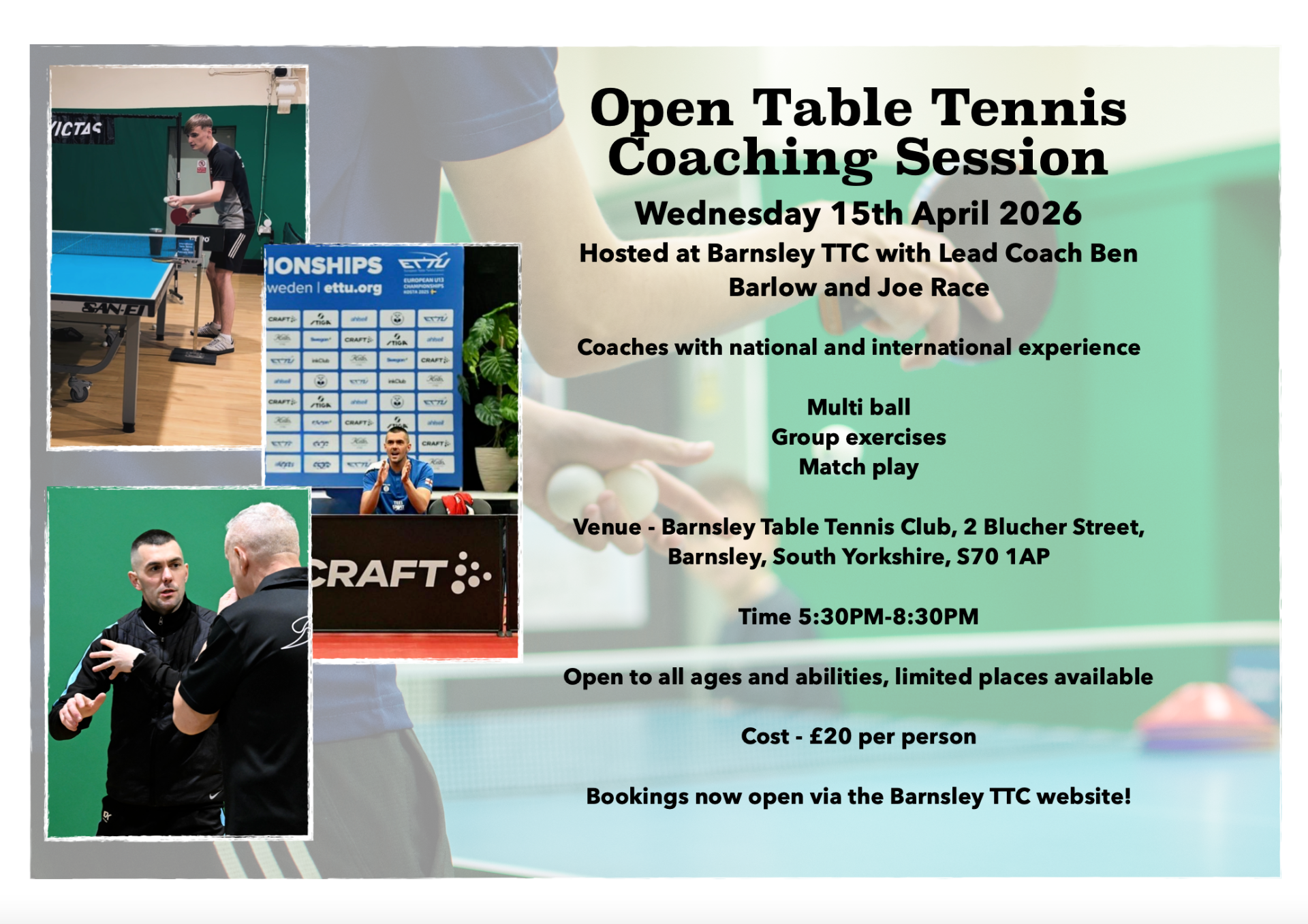 Bookings are now open for our next Open Coaching Session at Barnsley Table Tennis Club. The sessions are led by Barnsley TTC Lead Coach Ben Barlow and Head of Organisation Joe Race, with the sessions open to players of all ages and abilities. These three hour sessions will run once per month, with bookings required for each session.